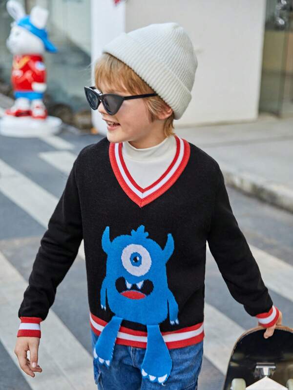 SHEIN Kids QTFun Tween Boy 1pc Cartoon Pattern Striped Trim Sweater