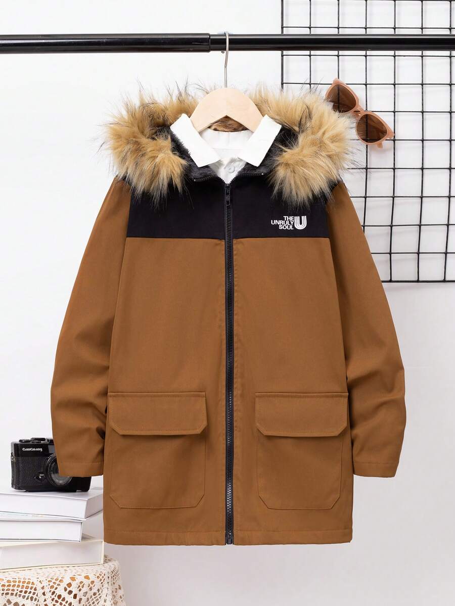 SHEIN Tween Boy 1pc Letter Graphic Fuzzy Trim Hooded Thermal Lined Coat