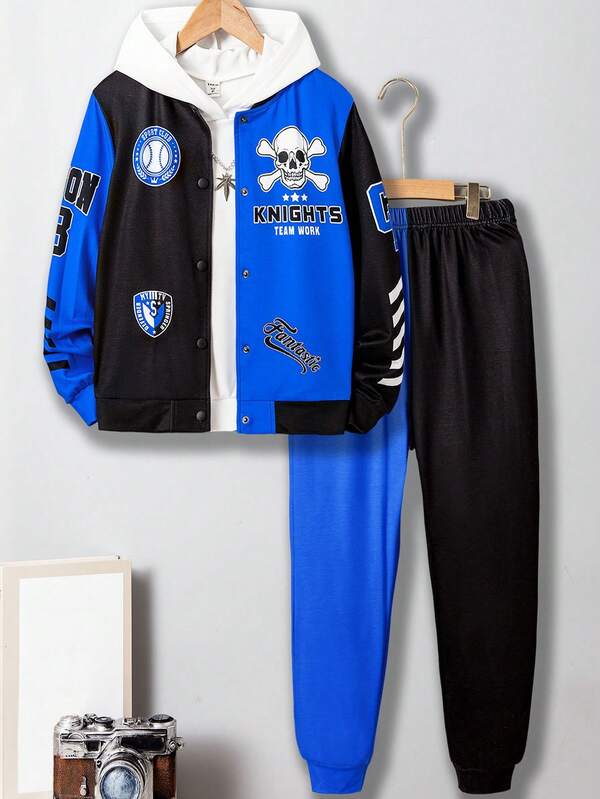 Tween Boy 1pc Letter Graphic Two Tone Jacket & 1pc Sweatpants
