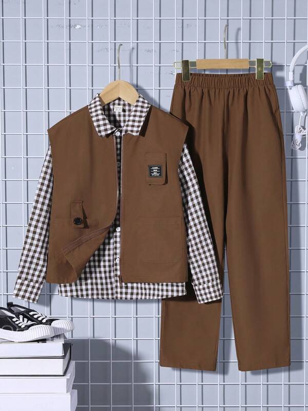 SHEIN Kids Academe Tween Boy 1pc Letter Patched Detail Vest Jacket & 1pc Pants & 1pc Gingham Shirt