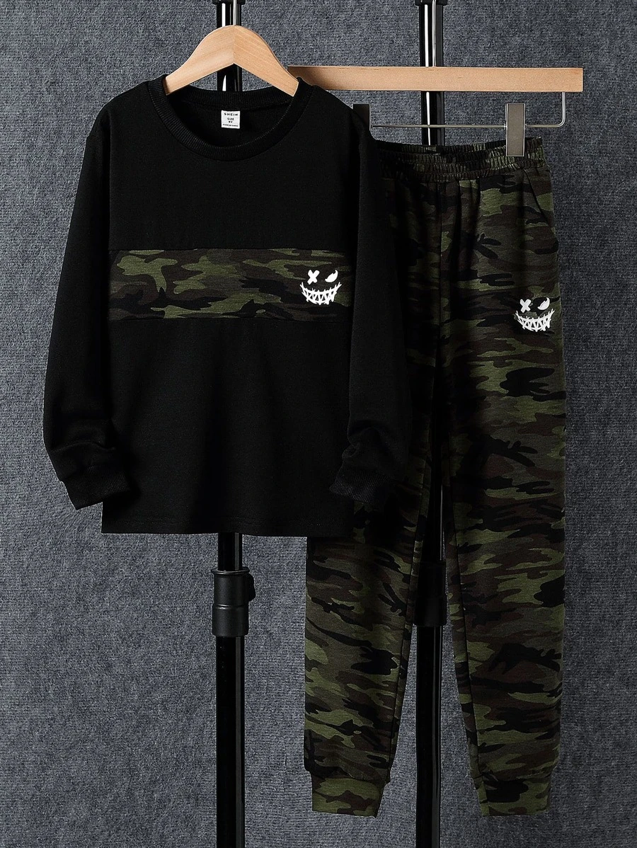 SHEIN Tween Boy Camo & Expression Print Pullover & Sweatpants