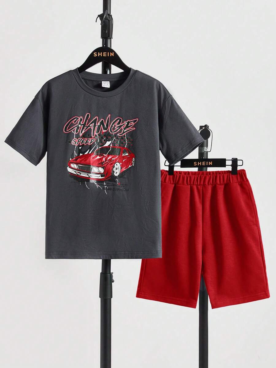 SHEIN Tween Boy Car & Letter Graphic Tee & Shorts