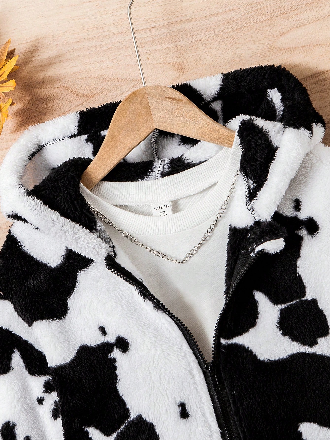 Tween Boy Cow Pattern Drop Shoulder Hooded Teddy Coat Without Tee