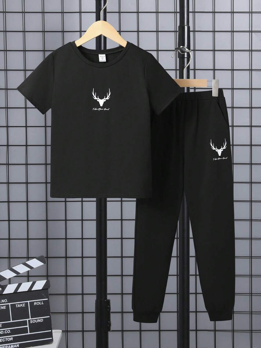SHEIN Tween Boy Deer & Slogan Graphic Tee & Sweatpants