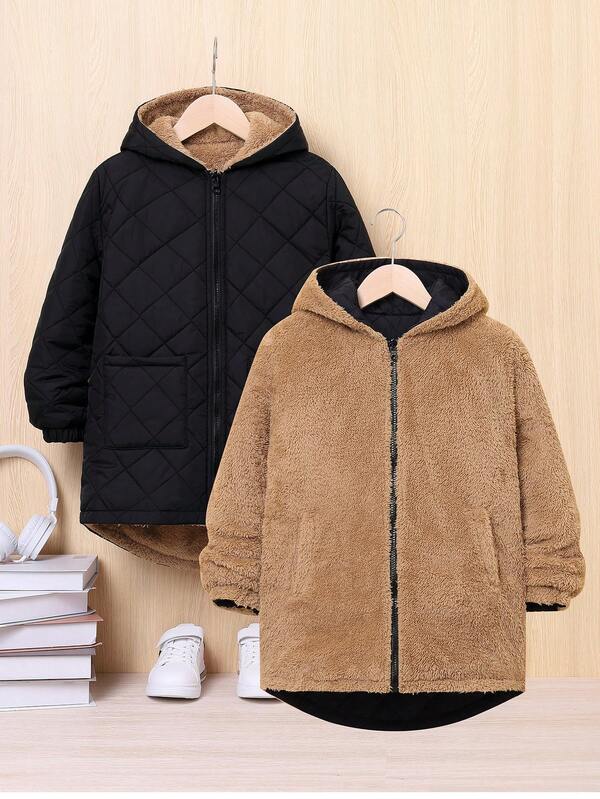 SHEIN Kids EVRYDAY Tween Boy Dual Pocket Zipper Hooded Thermal Lined Reversible Winter Coat