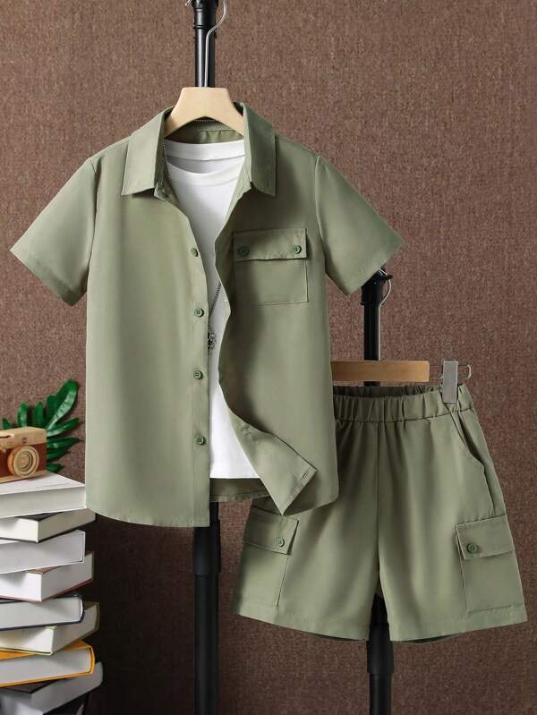 SHEIN Kids EVRYDAY Tween Boy Flap Pocket Shirt & Shorts Without Tee