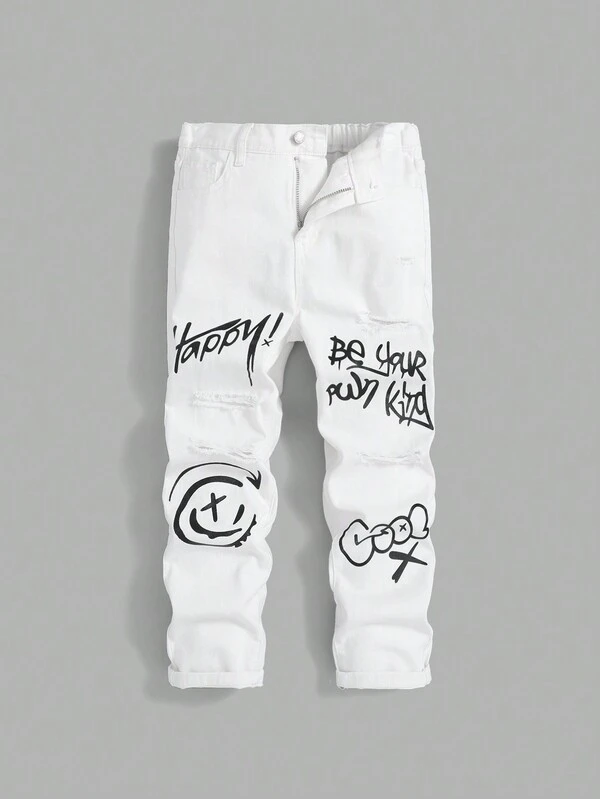 SHEIN Tween Boy Letter & Cartoon Graphic Ripped Jeans