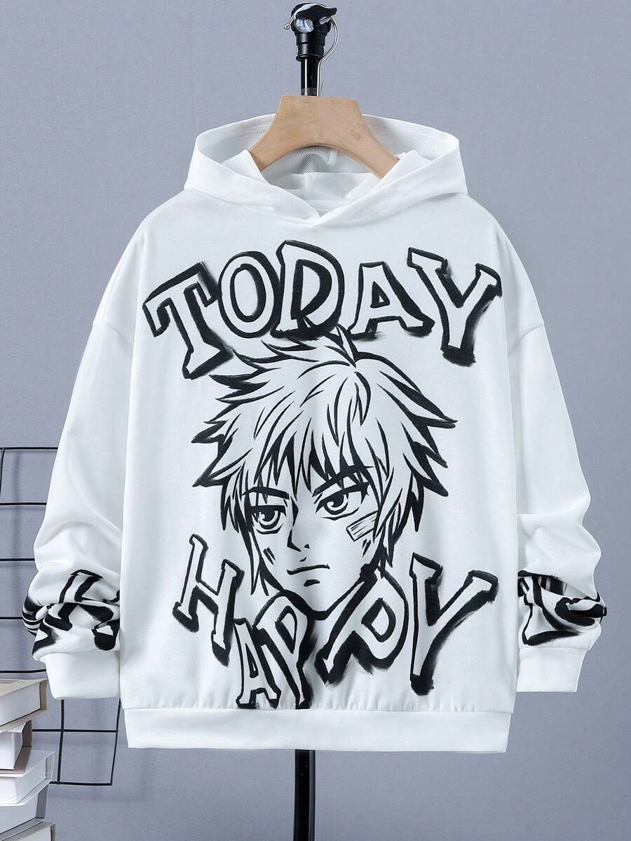 SHEIN Tween Boy Letter & Figure Graphic Hooded Sweatshirt