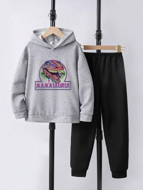Tween Boy Letter And Dinosaur Print Hoodie And Long Pants Sports 2pcs Set