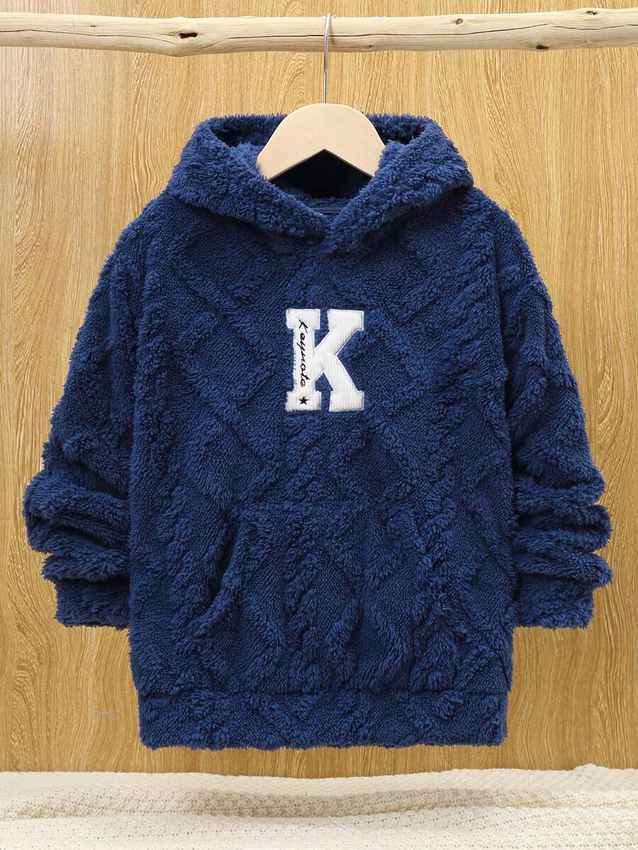 SHEIN Tween Boy Letter Embroidery Kangaroo Pocket Teddy Hoodie