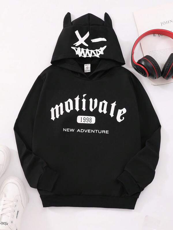 Tween Boy Letter Graphic 3D Ear Design Hoodie