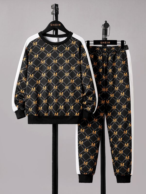 SHEIN Kids EVRYDAY Tween Boy Letter Graphic Contrast Side Seam Pullover & Sweatpants