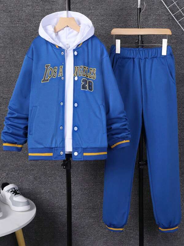 Tween Boy Letter Graphic Striped Trim Jacket & Sweatpants Without Hoodie