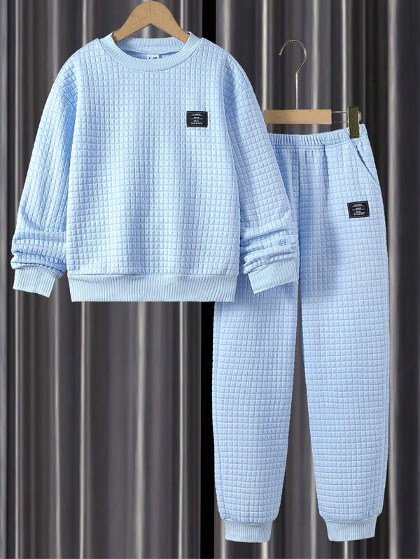SHEIN Kids EVRYDAY Tween Boy Letter Patched Detail Drop Shoulder Sweatshirt & Sweatpants