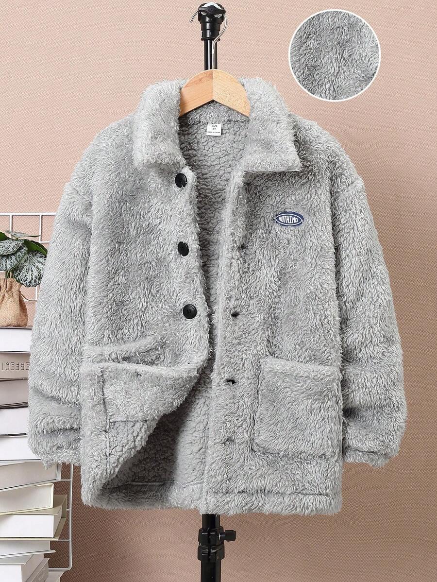 SHEIN Tween Boy Letter Patched Detail Dual Pocket Drop Shoulder Teddy Coat