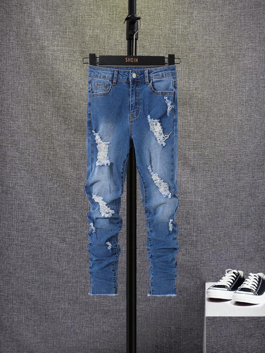 SHEIN Tween Boy Ripped Frayed Raw Trim Ripped Frayed Bleach Wash Jeans