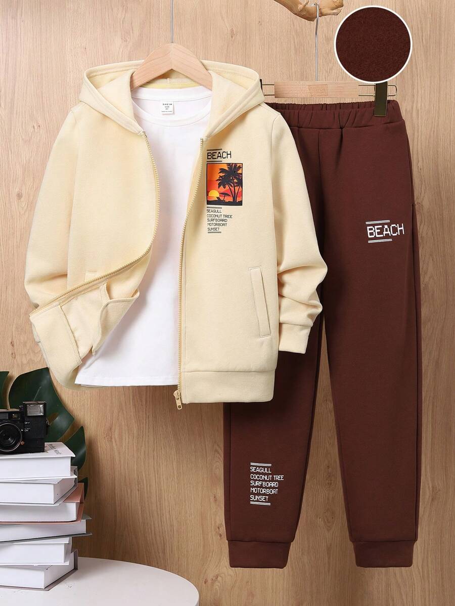 SHEIN Tween Boy Slogan Graphic Thermal Lined Hooded Jacket & Sweatpants Without Tee