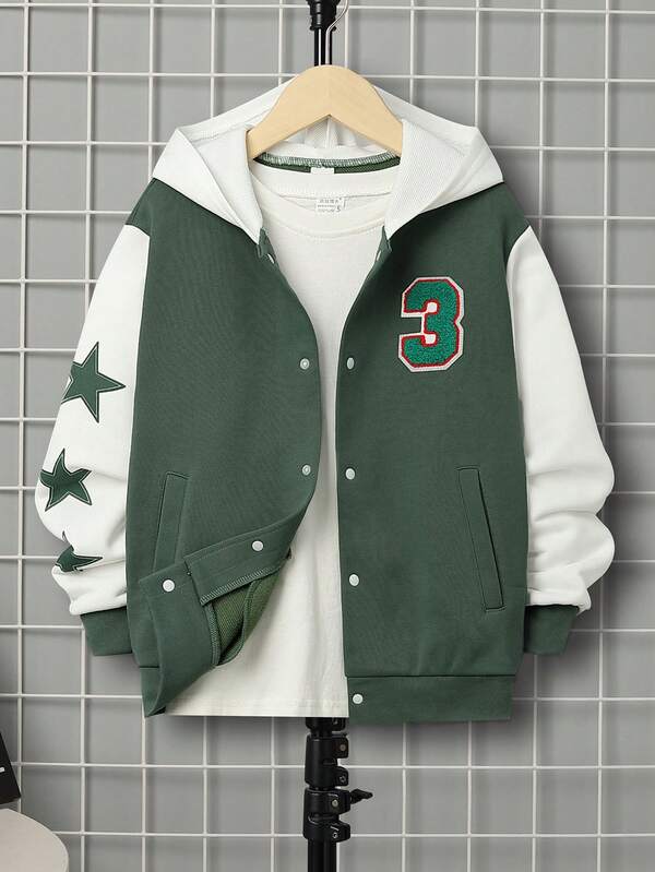 SHEIN Tween Boy Star Print Patched Detail Two Tone Hooded Jacket Without Tee