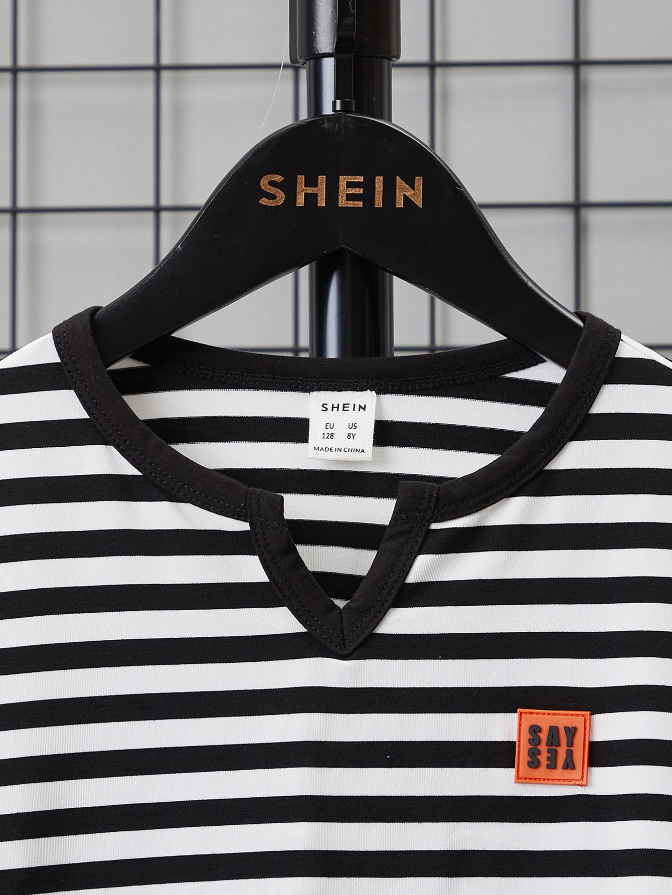 SHEIN Kids EVRYDAY Tween Boy Striped Print Letter Patched Detail Notched Neck Tee