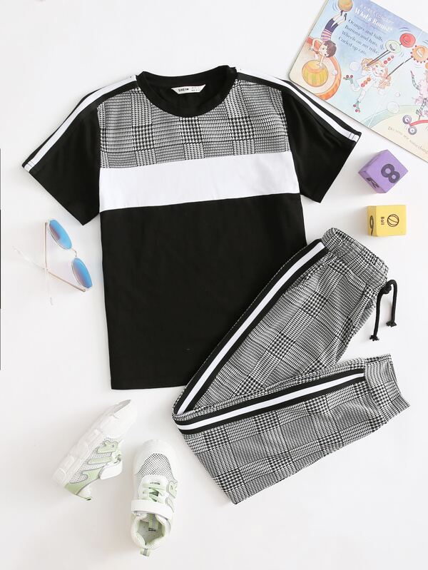 SHEIN Kids Academe Tween Boy Striped Tape Shoulder Plaid Yoke Top & Pants Set