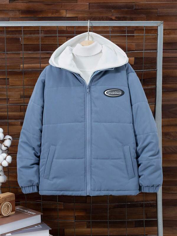 SHEIN Tween Boy Zip Up Patch Detail Hooded Winter Coat Without Sweater