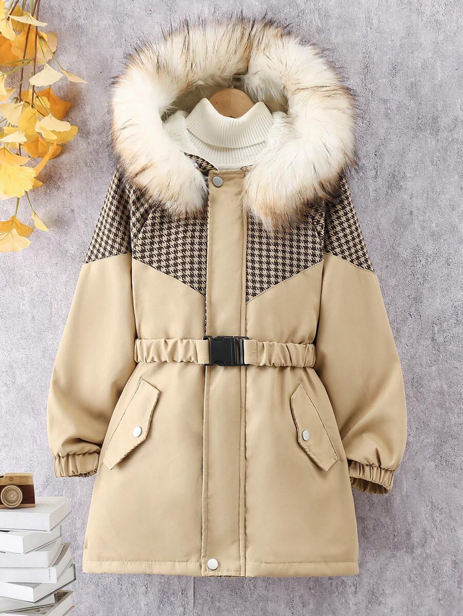 Tween Girl 1pc Houndstooth Pattern Fuzzy Trim Hooded Buckle Belted Coat