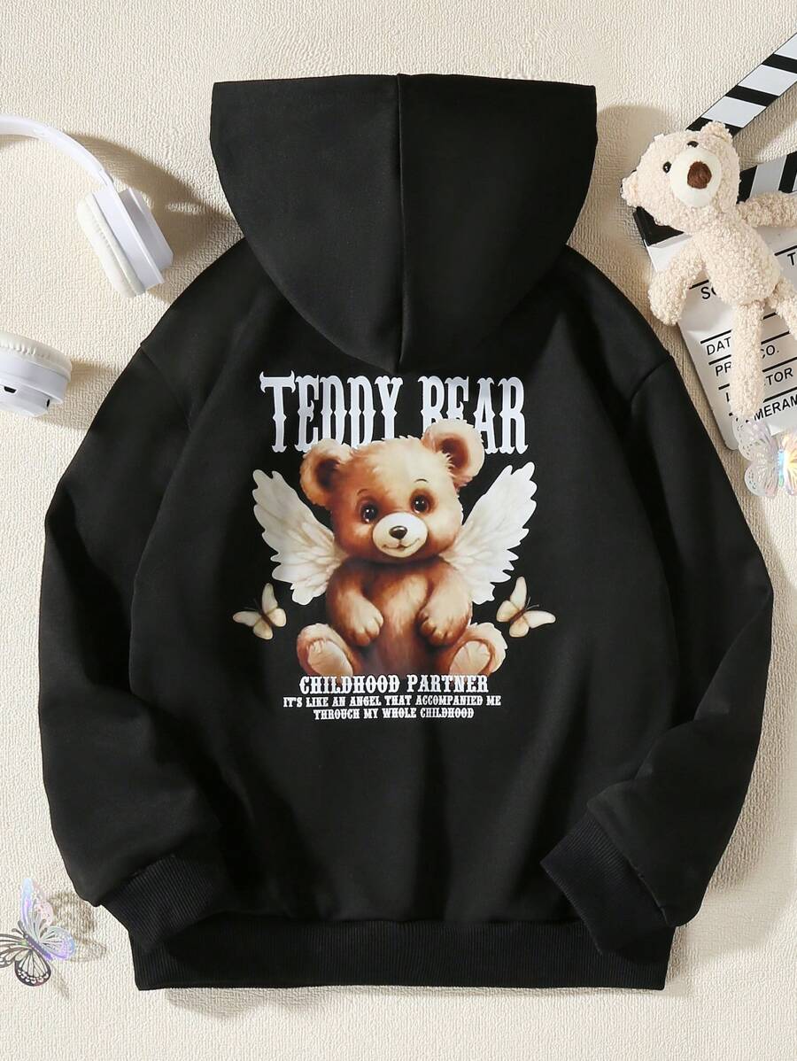 SHEIN Kids HYPEME Tween Girl Bear & Slogan Graphic Hoodie
