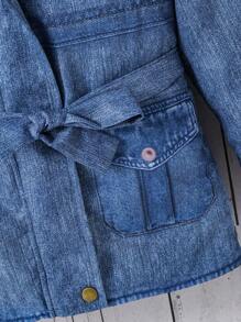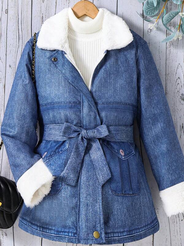 Tween Girl Borg Collar Belted Denim Coat Without Sweater