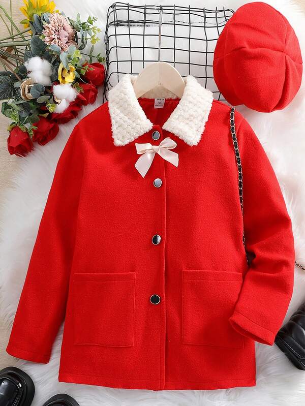 Tween Girl Borg Collar Dual Pocket Bow Front Overcoat & Hat for Christmas