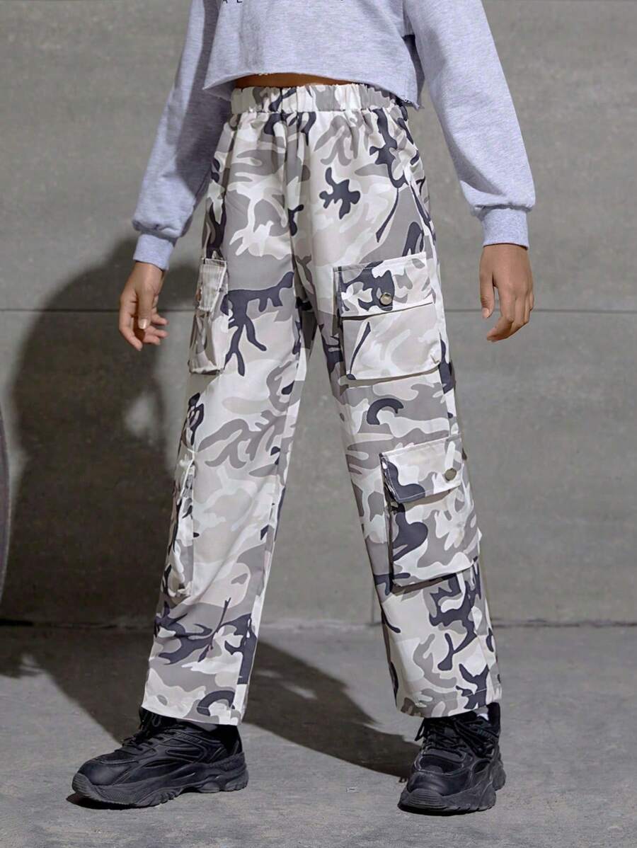Tween Girl Camo Print Flap Pocket Side Cargo Pants