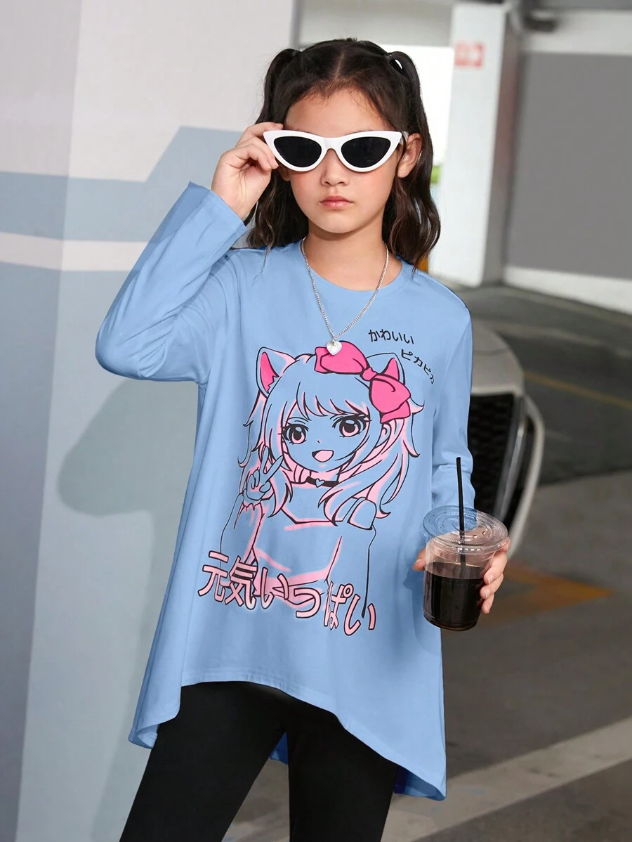 SHEIN Tween Girl Cartoon & Letter Graphic High Low Hem Tee