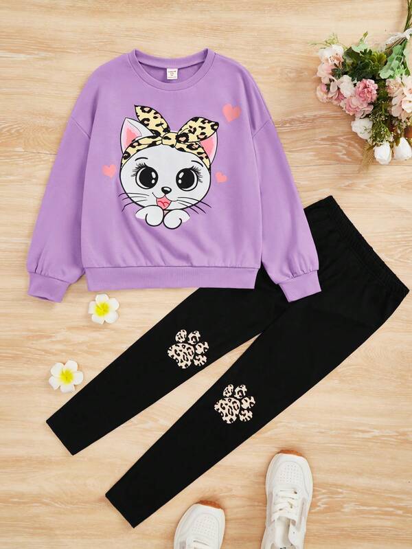 SHEIN Kids QTFun Tween Girl Cartoon Graphic Pullover & Leggings
