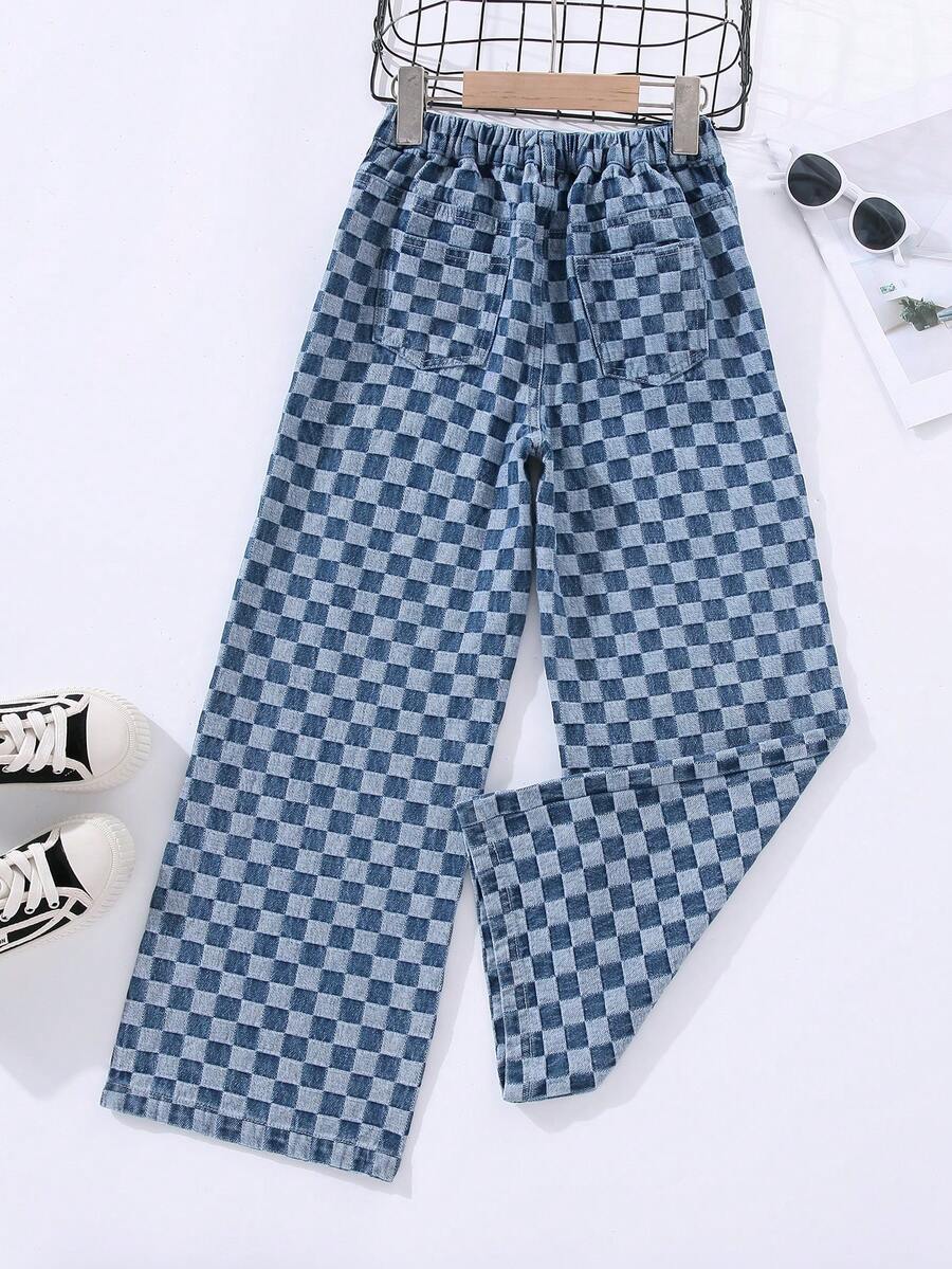 Tween Girl Checker Print Elastic Waist Wide Leg Jeans