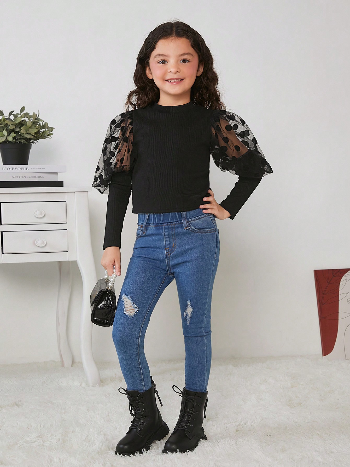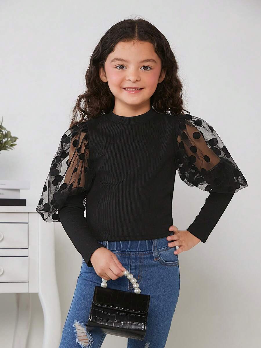 SHEIN Kids Cooltwn Tween Girl Contrast Dobby Mesh Gigot Sleeve Tee