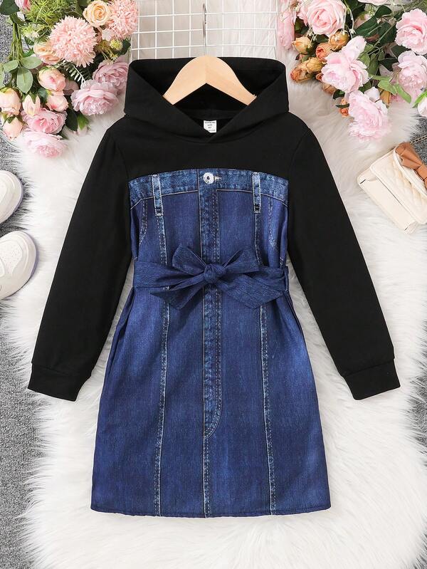 Tween Girl Denim-Effect Print Two Tone Hooded Belted Dress