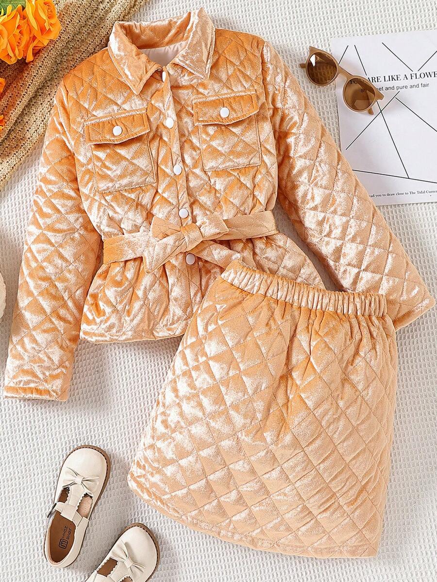 Tween Girl Flap Pocket Quilted Belted Winter Coat & Skirt