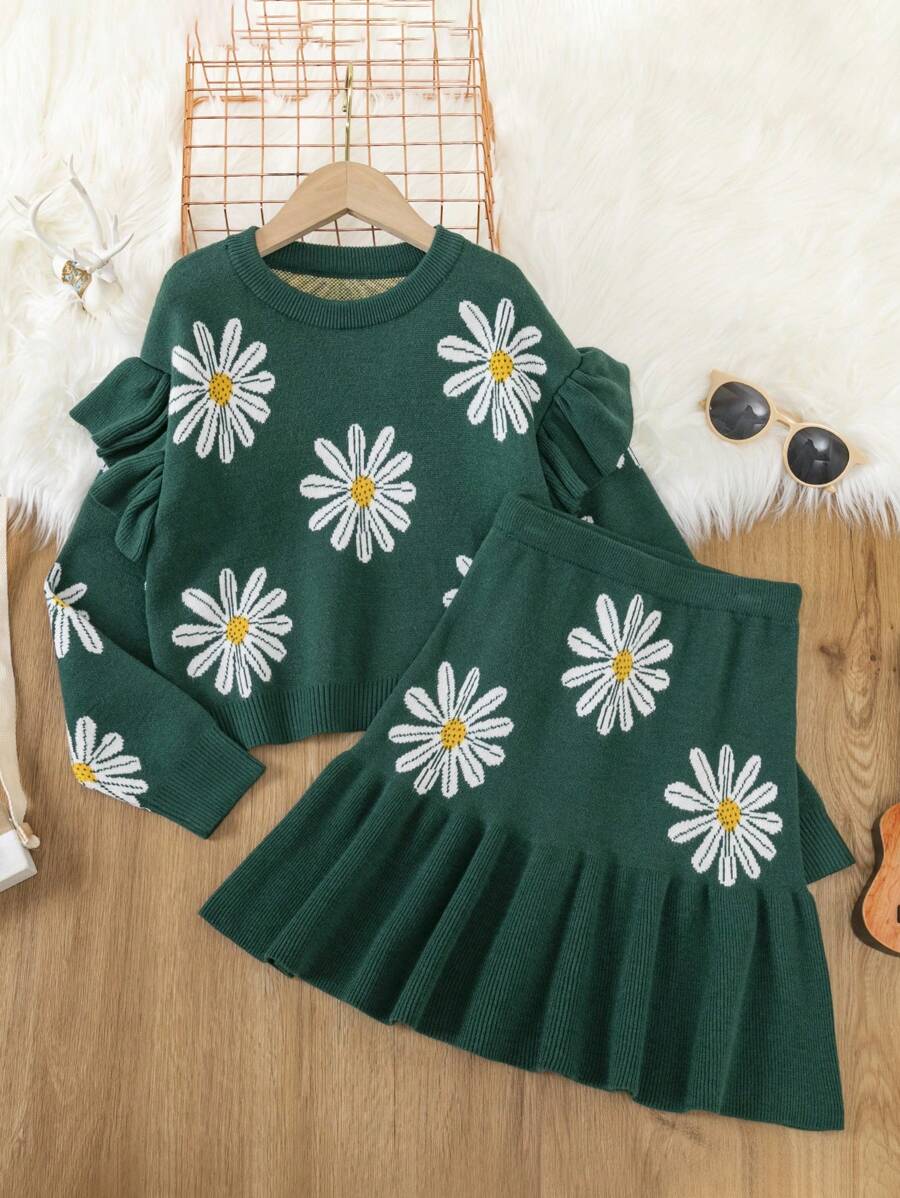 SHEIN Kids EVRYDAY Tween Girl Floral Pattern Ruffle Trim Sweater & Peplum Hem Skirt