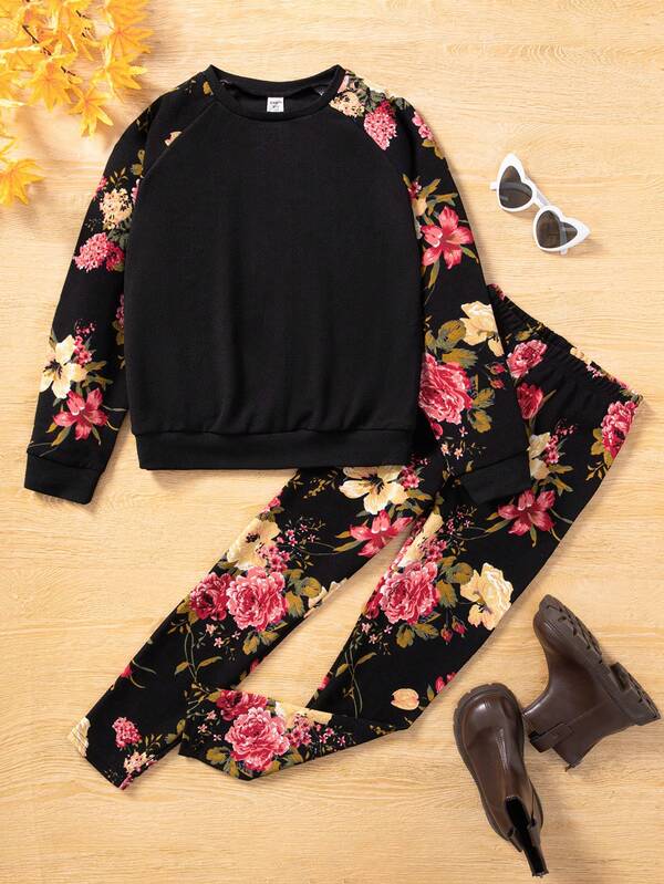 SHEIN Kids SUNSHNE Tween Girl Floral Print Raglan Sleeve Pullover & Leggings