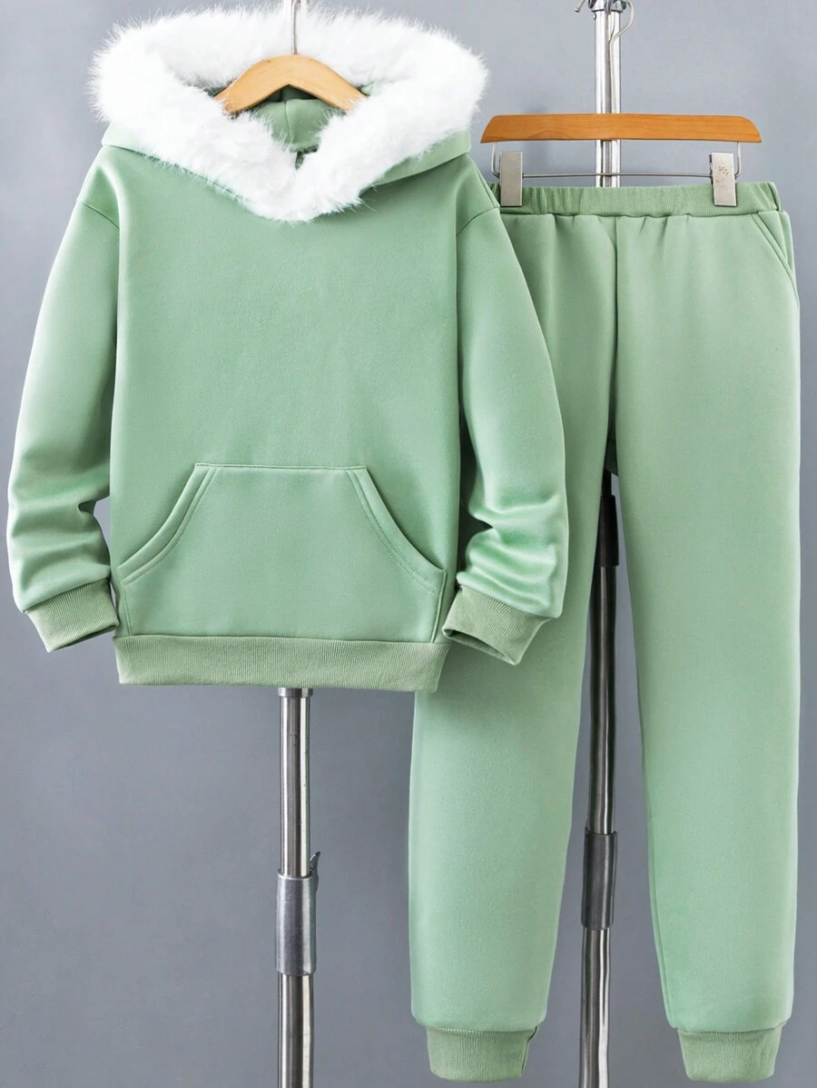 Tween Girl Fuzzy Trim Kangaroo Pocket Hoodie & Sweatpants
