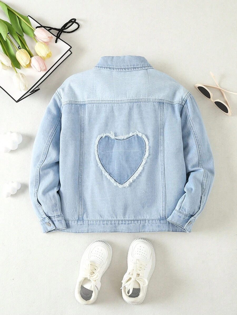 Tween Girl Heart Pattern Denim Jacket