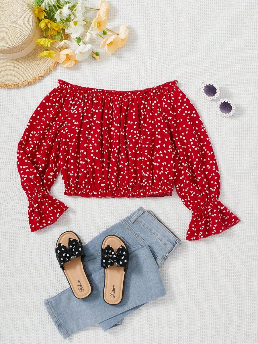 SHEIN Kids FANZEY Tween Girl Heart Print Off Shoulder Flounce Sleeve Crop Blouse