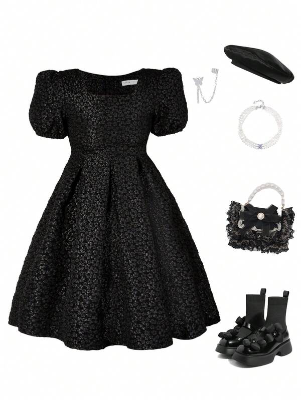 Tween Girl Jacquard Puff Sleeve Fold Pleated Detail Dress