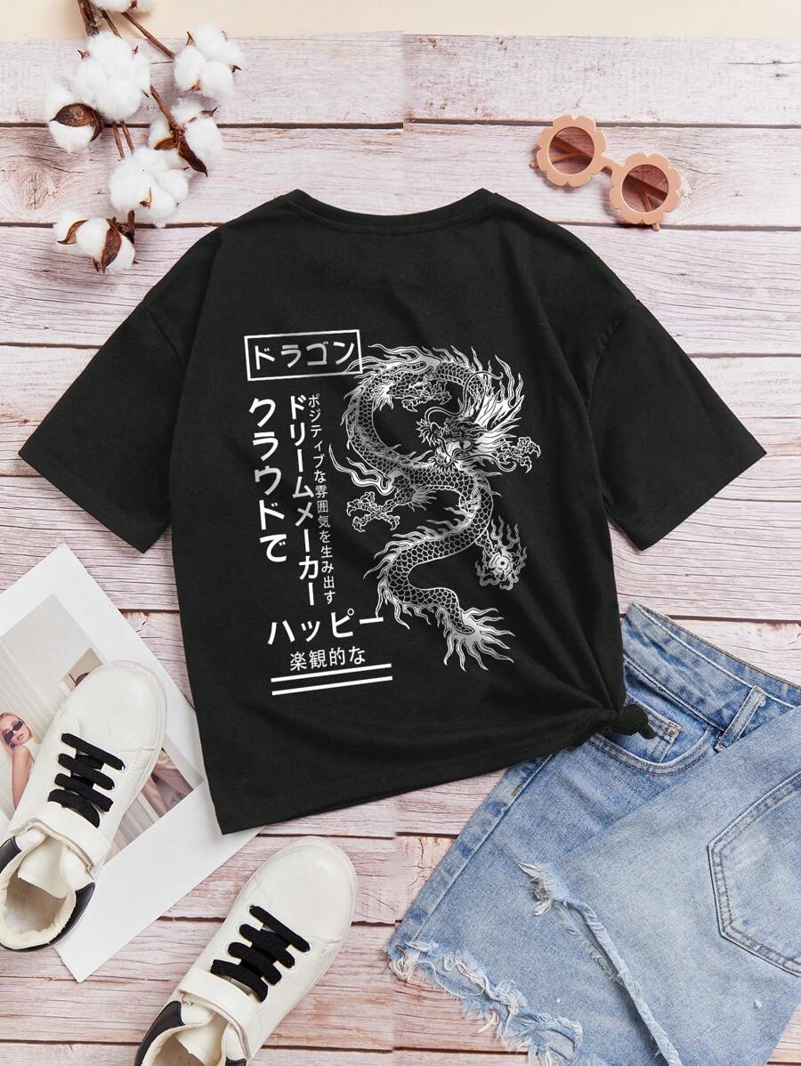 Tween Girl Japanese Letter & Chinese Dragon Graphic Tee