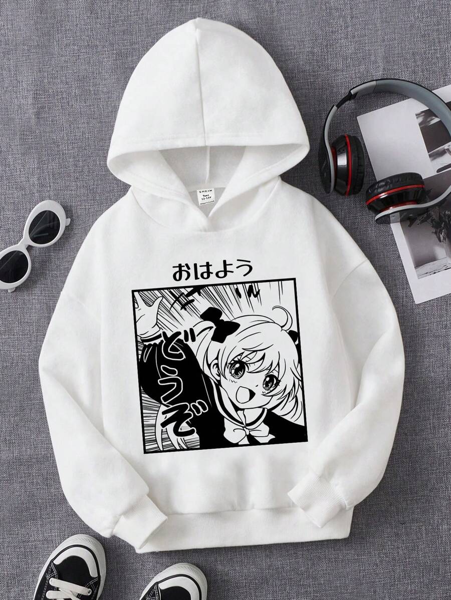 Tween Girl Japanese Letter & Figure Graphic Hoodie