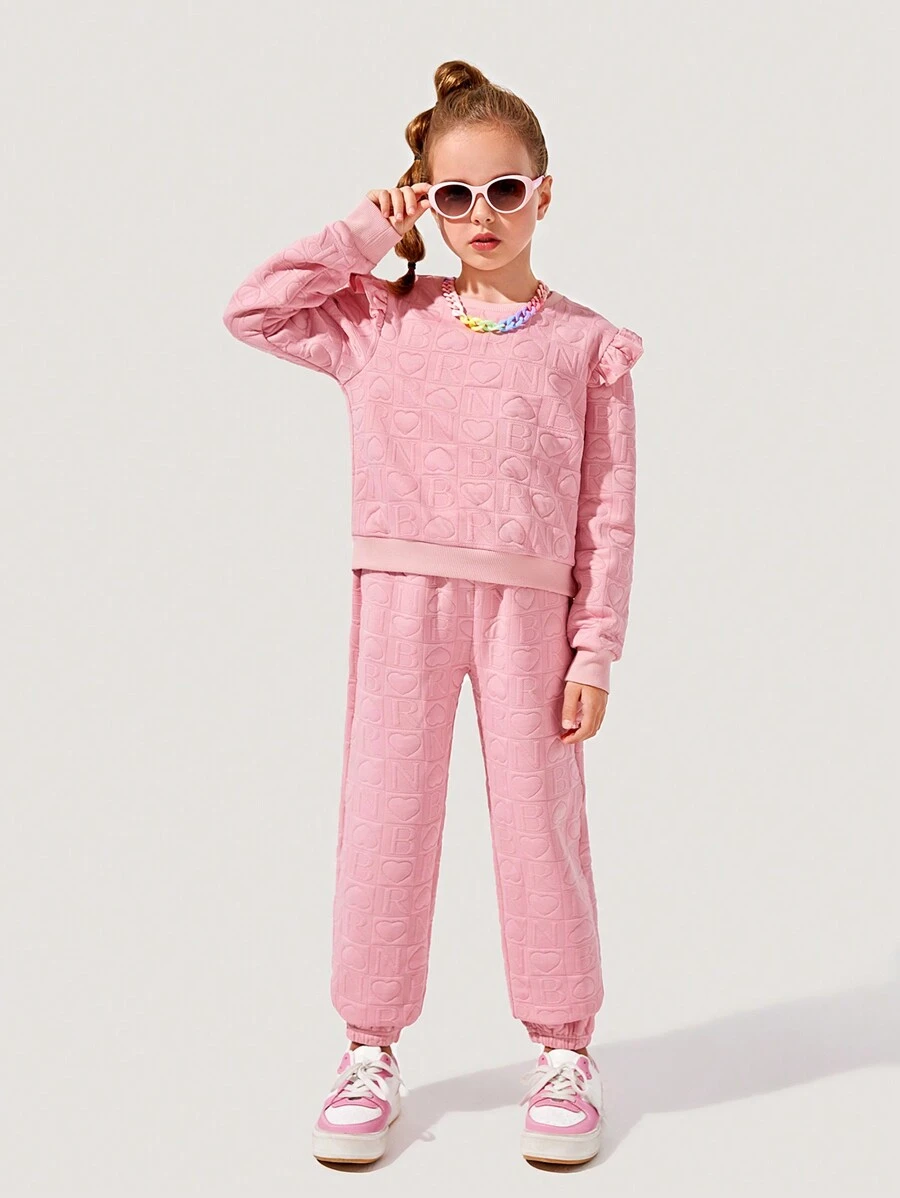 JNSQ Tween Girl Letter Embossed Ruffle Trim Sweatshirt & Sweatpants