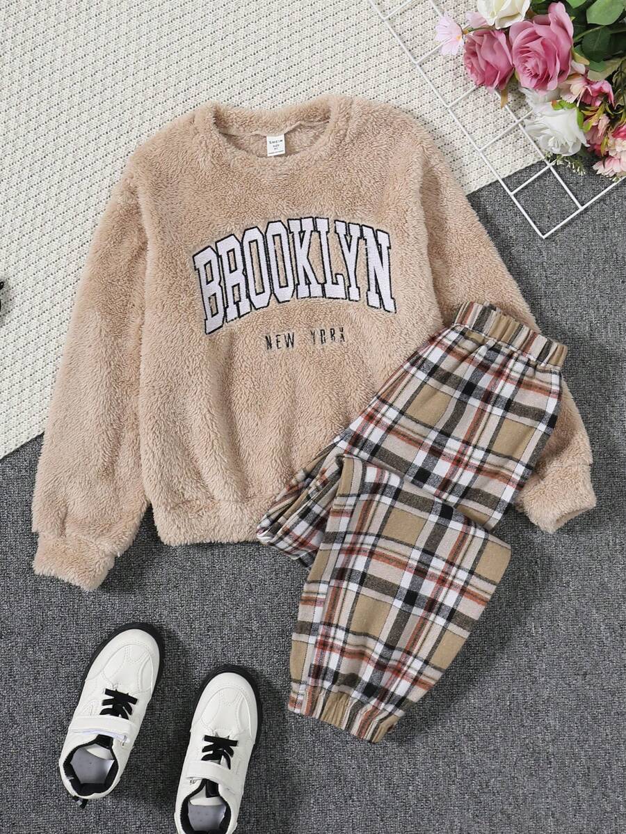 SHEIN Tween Girl Letter Embroidery Flannel Sweatshirt & Plaid Pants