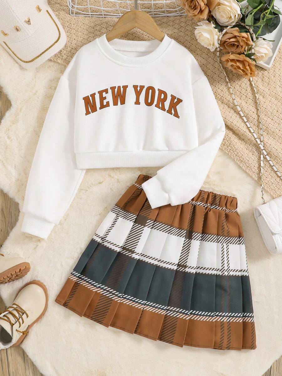 Tween Girl Letter Graphic Pullover & Plaid Pleated Skirt