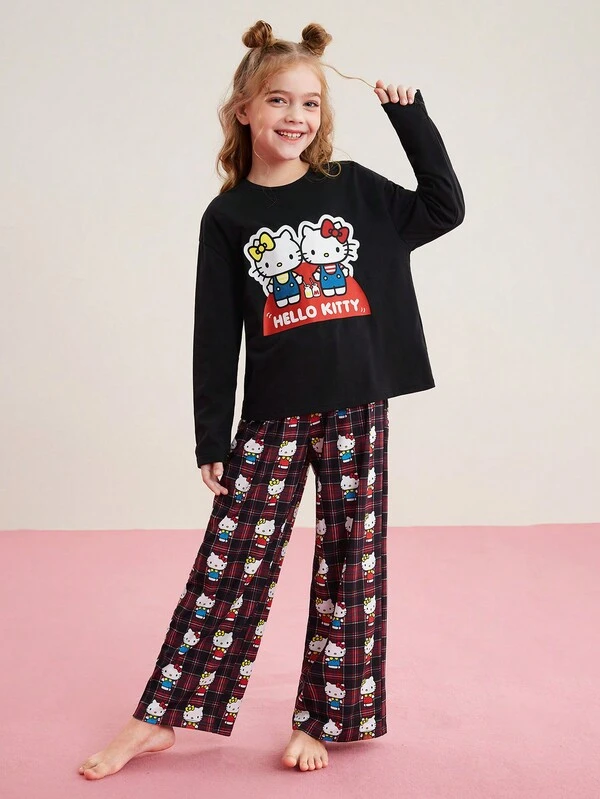 HELLO KITTY AND FRIENDS | SHEIN Tween Girl Letter Plaid Printed Home Clothes Set