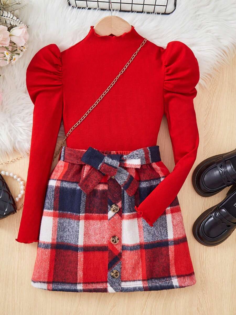 SHEIN Tween Girl Mock Neck Gigot Sleeve Tee & Plaid Print Belted Skirt