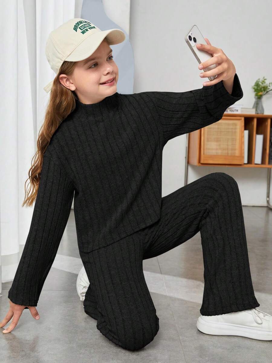 SHEIN Tween Girl Mock Neck Ribbed Knit Tee & Pants